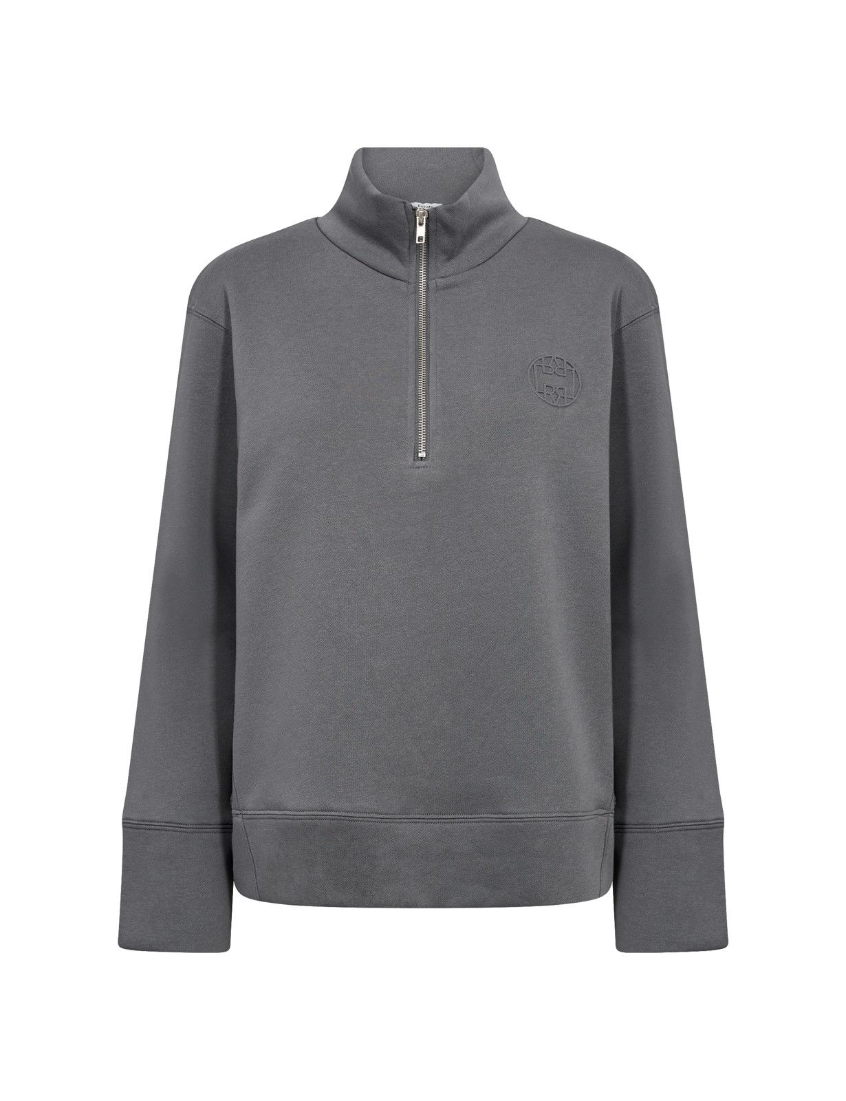 LR-NUKA 14 Sweatshirt er fremstillet af 80 % genbrugspolyester og 20 % økologisk bomuld. Den har en halv lynlås foran med en høj krave og en diskret broderet detalje på brystet.