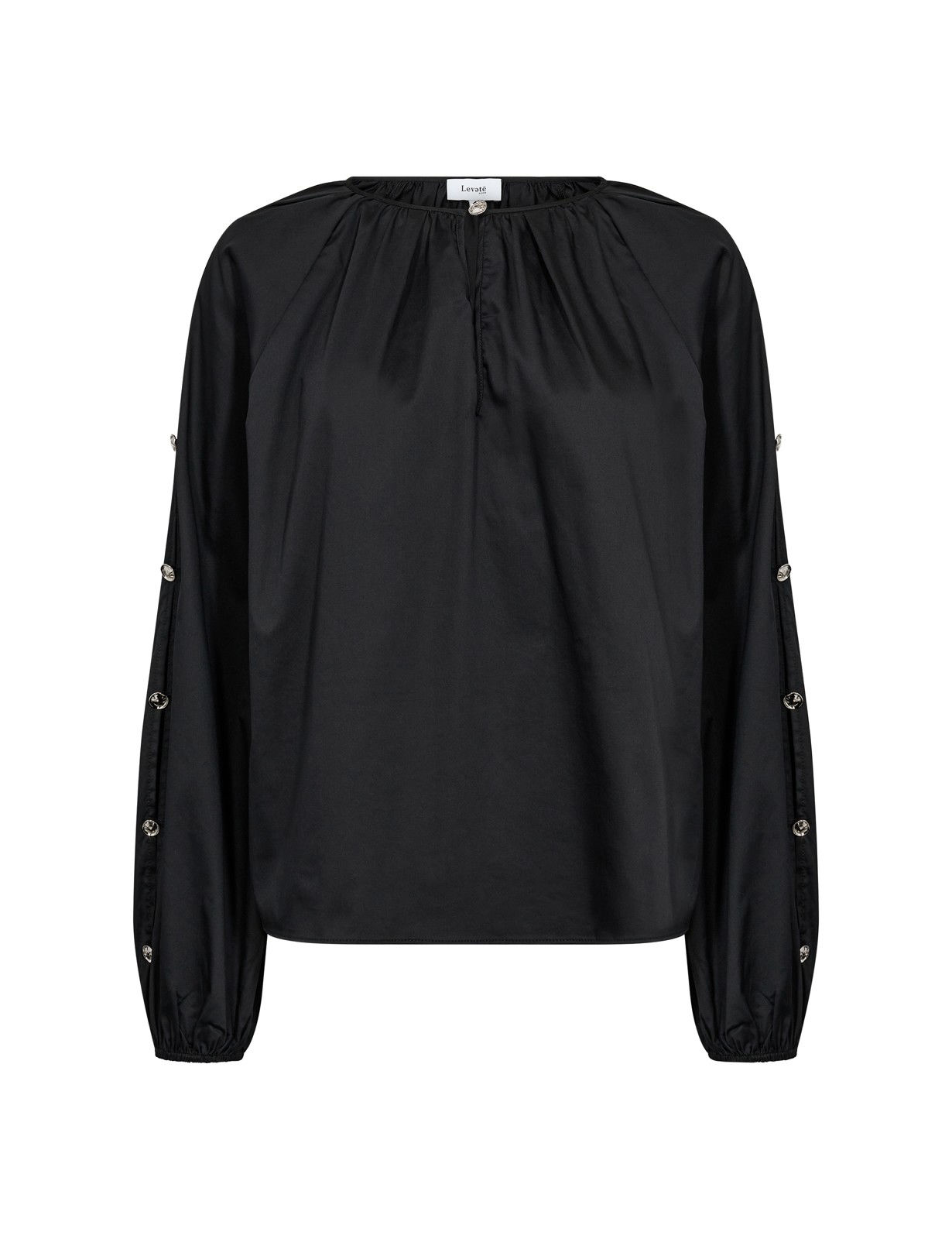 LR-ISLA SOLID 131 bluse er fremstillet af 65% økologisk bomuld, 30% polyamid og 5% elastan. Blusen har elegante knapdetaljer langs de lange ærmer og en rund halsudskæring med diskrete læg.