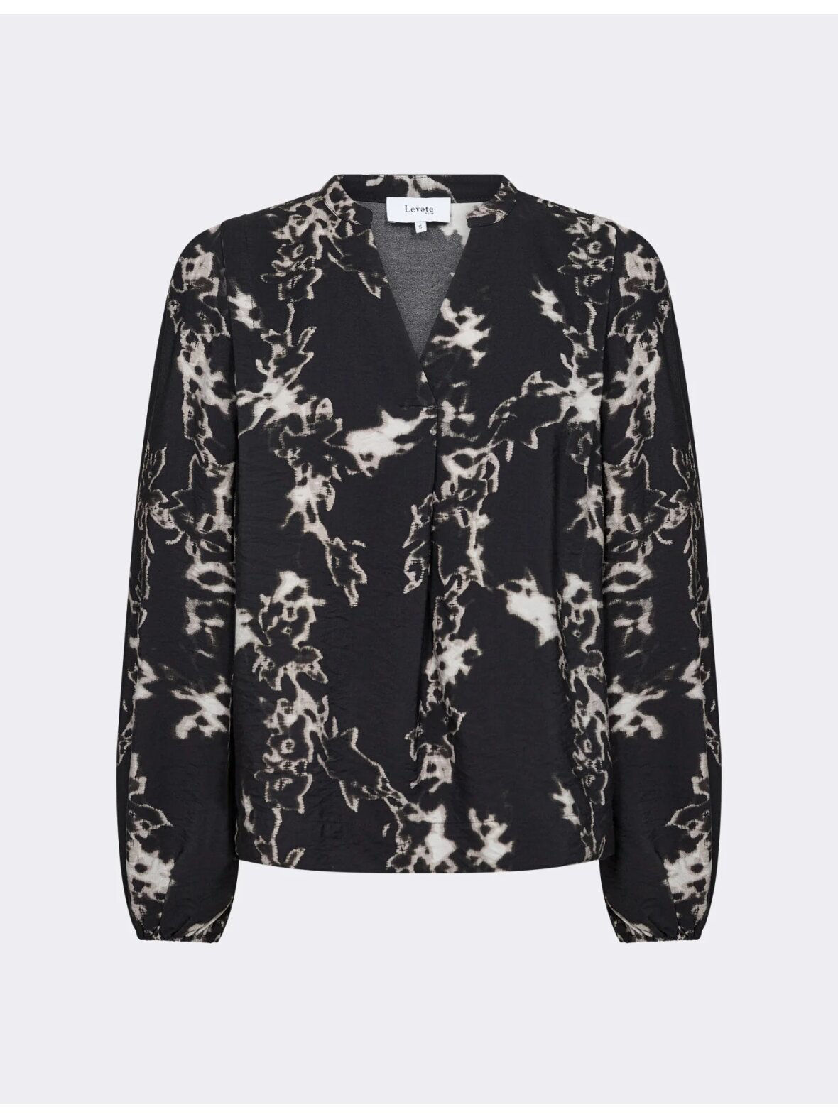 LR-NELSY 2 er en fin skjorte lavet af 88% LENZING™ ECOVERO™ viskose, 12% polyamid. Designet omfatter en V-hals med subtile flæsedetaljer, knaplukning og et unikt abstrakt print.