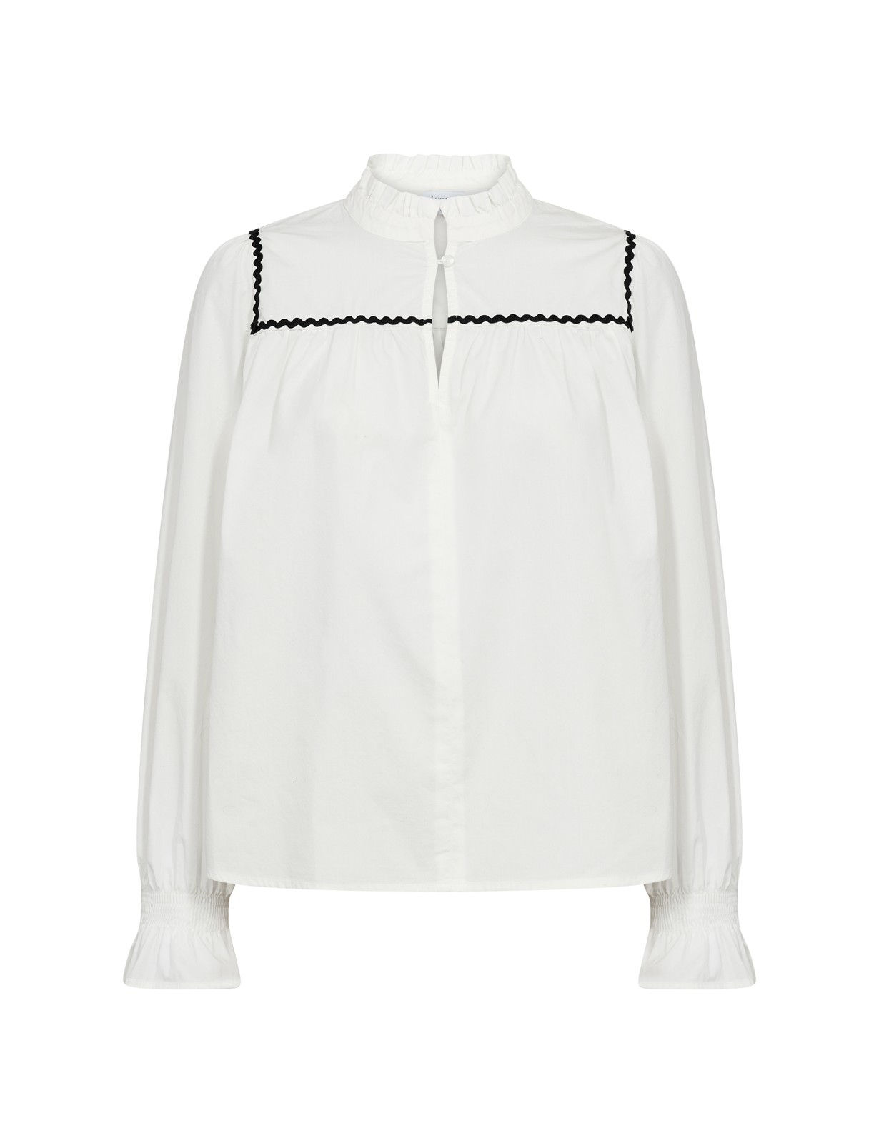 LR-OTTO 2 er en bluse fremstillet af 100 % økologisk bomuld. Denne elegante bluse har en flæsekrave, en fin nøglehulslukning med knap og en charmerende bølgedetalje.