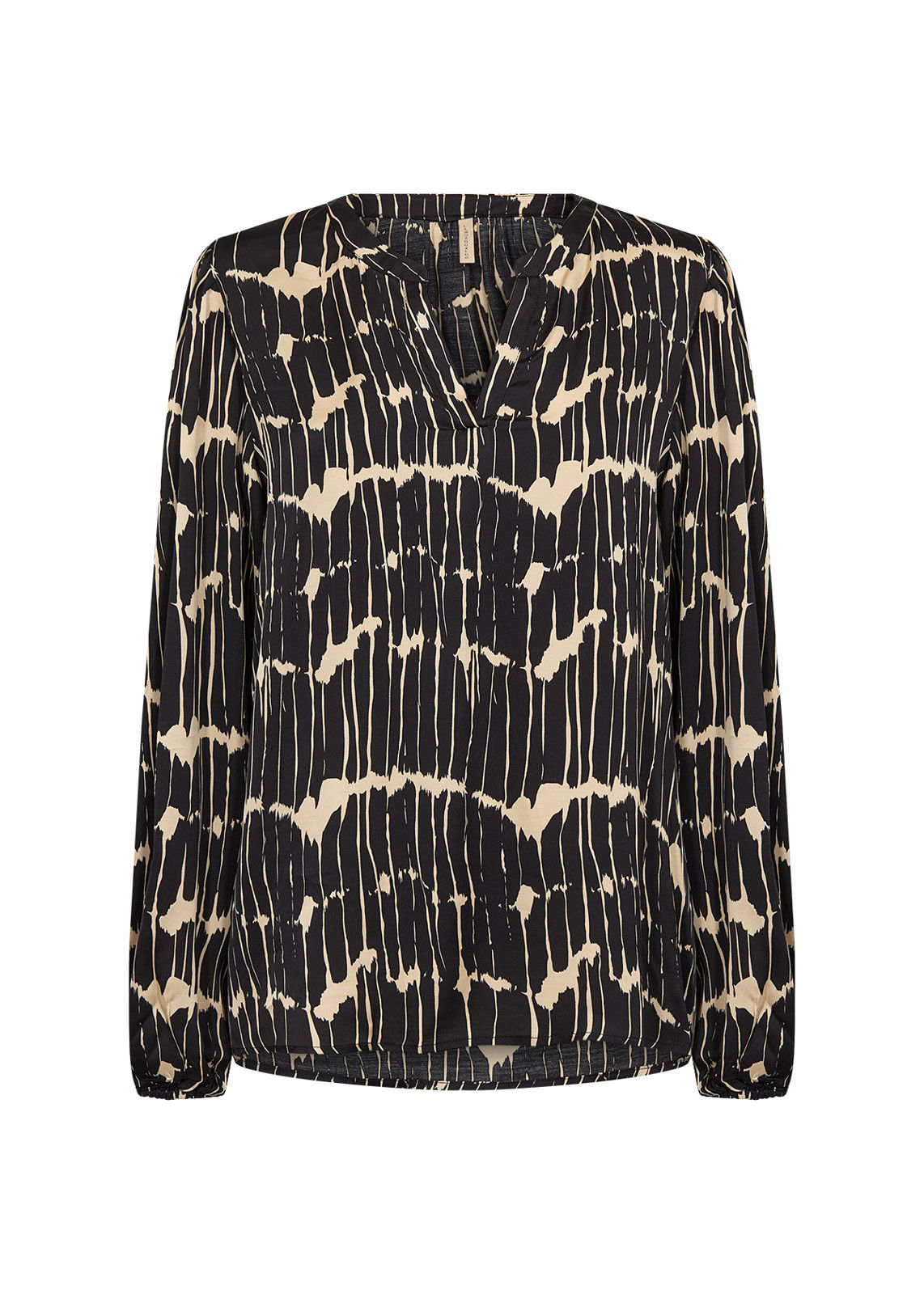 SC-ARLETTE 1 er en bluse, fremstillet af 50 % LENZING™ ECOVERO™-viskose og 50 % viskose. Blusen har et unikt abstrakt print, en V-udskæring og lange ærmer med elastiske manchetter.