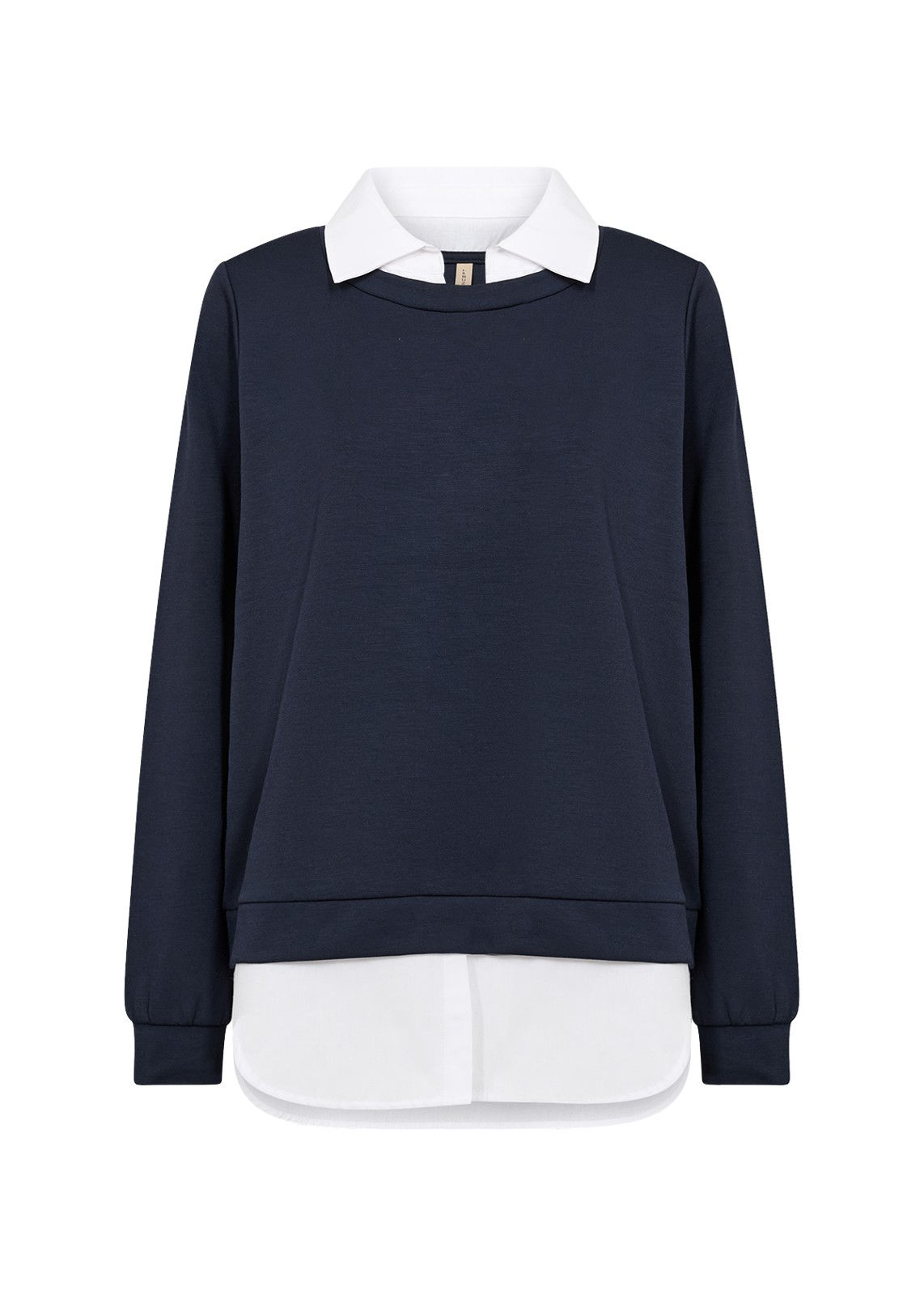 SC-BANU 271 Blusen består af 48 % modal, 48 % polyester og 4 % elastan. Den har en skarp skjortekrave med knapper og giver et lag-på-lag-look med en skjortekant, der strækker sig fra en blød strikket top.