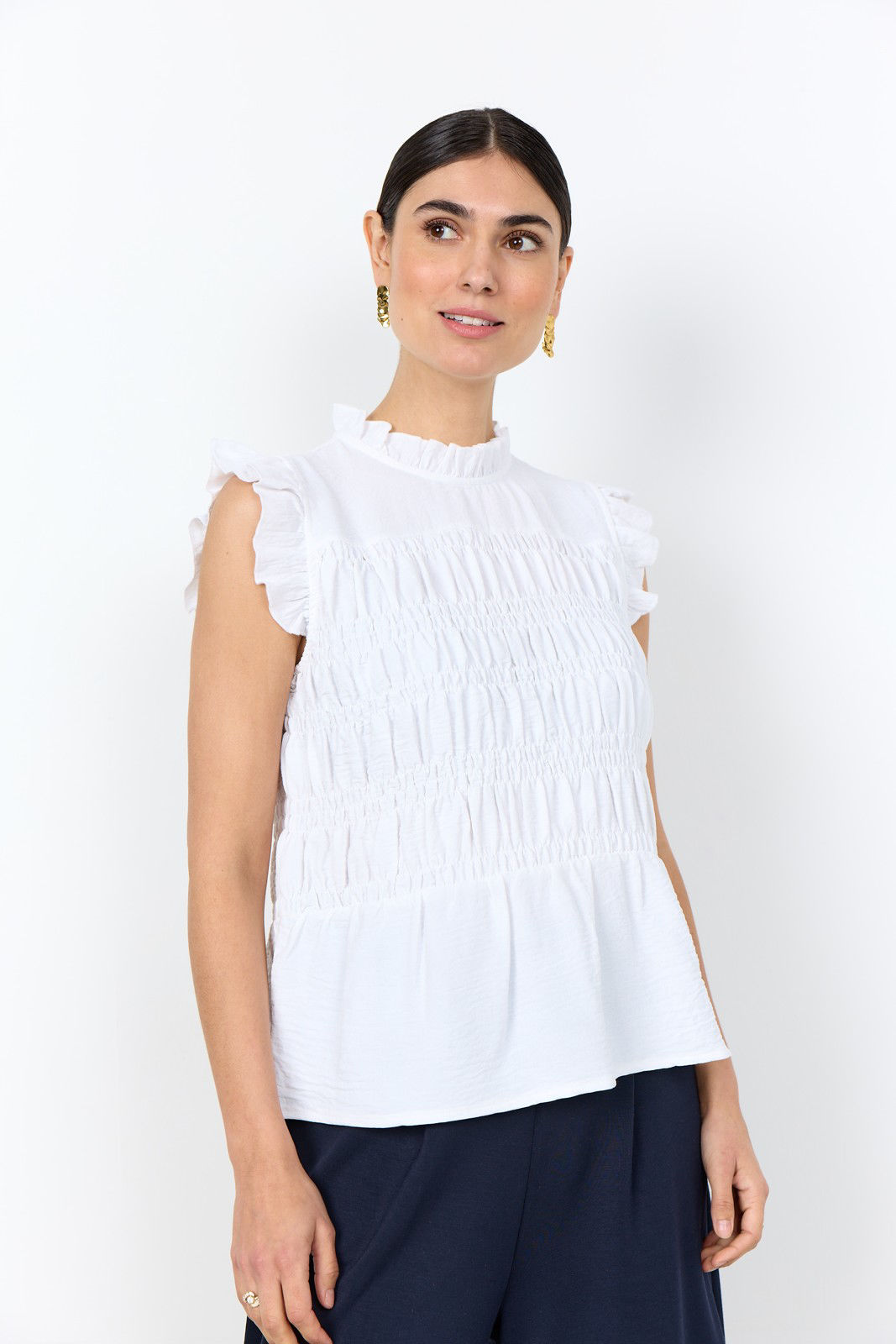 SC-CATH 6 er en top fremstillet af 100% polyester. Den har en høj krave med fine flæsedetaljer, korte ærmer og en smukt rynket tekstur.