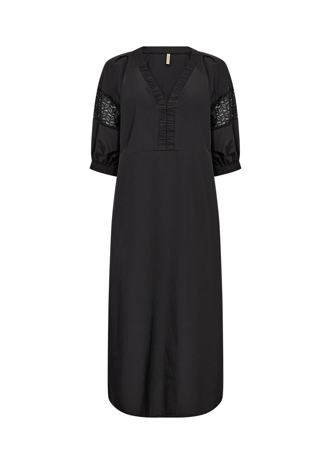 SC-NETTI 114 kjole er en blanding af 53% genbrugspolyester og 47% økologisk bomuld. Kjolen har elegante blondeindsatser på ærmerne, en V-udskæring med plisserede detaljer og en midilængde, der giver et sofistikeret look.